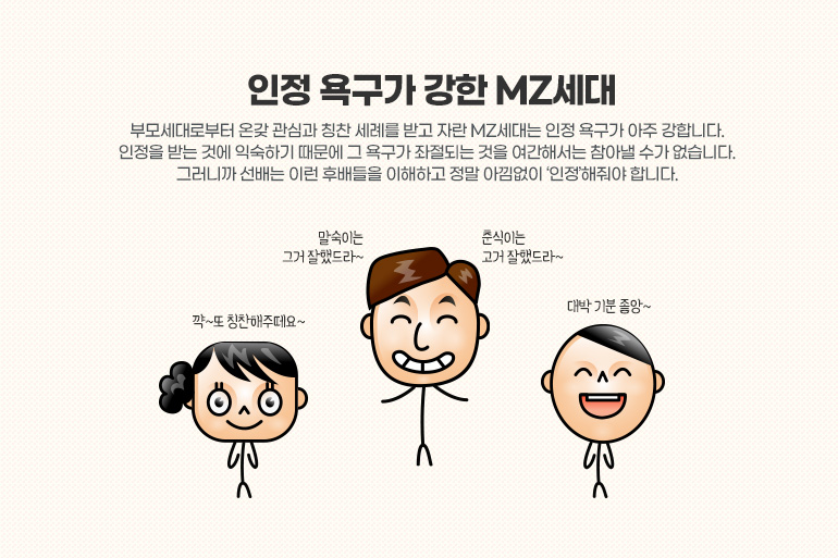 부모세대로부터 온갖 관심과 칭찬 세례를 받고 자란 MZ세대는 인정 욕구가 아주 강합니다. 실상 사람은 누구나 인정 욕구가 있기 마련인데요, 기성 세대는 그 경험이 적기 때문에 욕구 발현이 낯선 반면에 MZ세대는 반대죠. 인정을 받는 것에 익숙하기 때문에 그 욕구가 좌절되는 것을 여간해서는 참아낼 수가 없습니다.