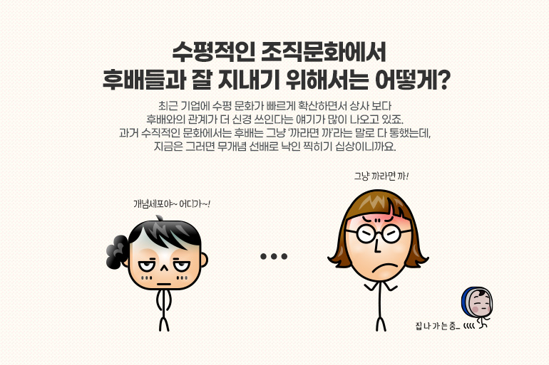 최근 기업에 수평 문화가 빠르게 확산하면서 상사 보다 후배와의 관계가 더 신경 쓰인다는 얘기가 많이 나오고 있죠. 과거 수직적인 문화에서는 후배는 그냥 ‘까라면 까’라는 말로 다 통했는데, 지금은 그러면 무개념 선배로 낙인 찍히기 십상이니까요. 수평적인 조직문화에서 후배들과 잘 지내기 위해서는 어떤 부분을 신경써야 할까요?