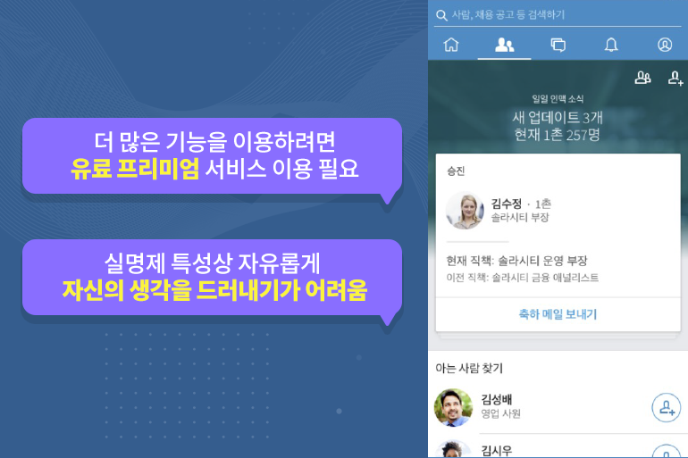 특히 자신이 관심있는 기업에 소속된 사람을 검색해 팔로우하거나 메시지를 보내 직접 소통할 수 있다는 것이 큰 장점이죠. 실명제로 운영되는 커뮤니티이기 때문에 정보의 신뢰성이 매우 높고, 전 세계인들이 활동하는 커뮤니티인 만큼 글로벌 인사이트를 가질 수 있어 많은 직장인들이 애용하고 있어요. 하지만 다양한 기능을 이용하기 위해서는 유료 프리미엄 서비스를 이용해야 하며, 실명제 특성상 자유롭게 자신의 생각을 드러내기가 어려운 부분이 있죠.