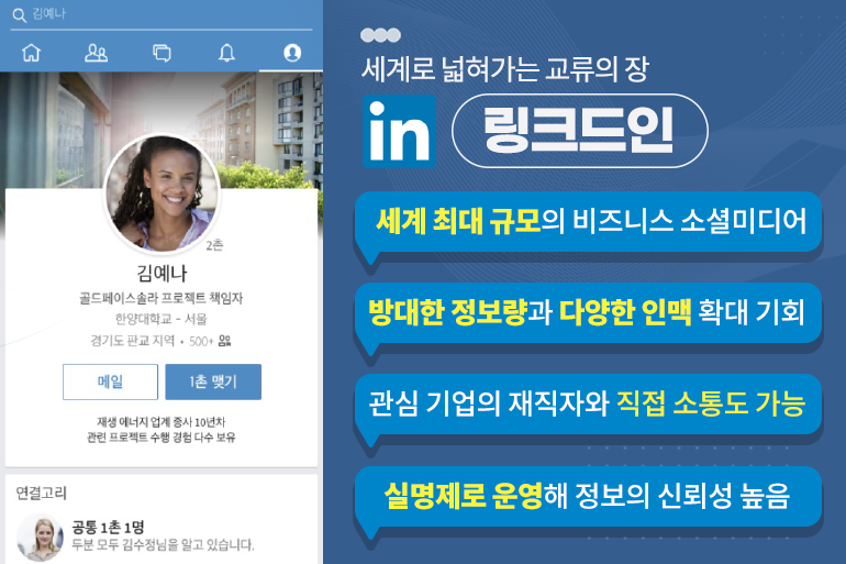 세계 최대 규모의 비즈니스 소셜미디어인 ‘링크드인’은 외국계 기업에 관심있는 직장인들에게는 필수 플랫폼으로 손꼽혀요. 링크드인에 자신의 전, 현직 직장 정보와 스펙 등을 등록해두면 국내외 기업의 인사담당자들이 이를 이력서처럼 활용해 인재를 찾을 때 활용하죠. 전 세계의 전문가들이 링크드인을 이용하는 만큼 얻을 수 있는 정보의 폭도 넓고, 다방면으로 인맥을 넓히는 데도 많은 도움이 돼요.