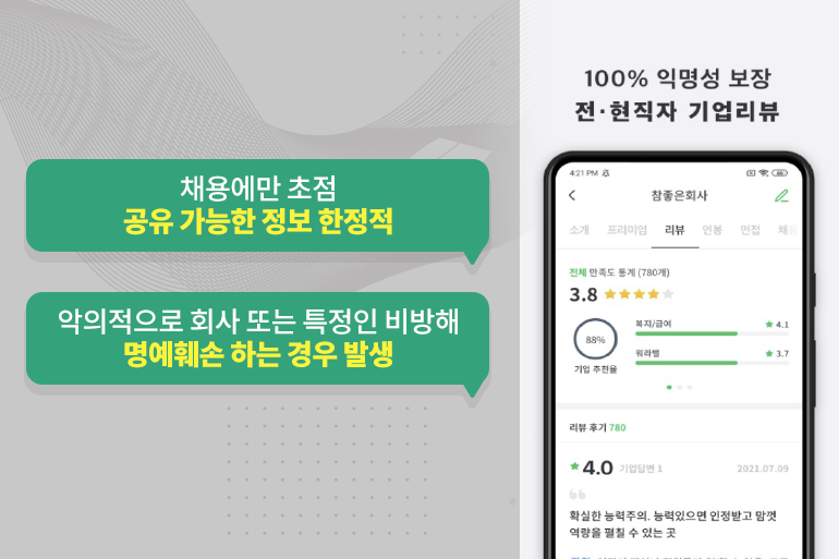 면접 후기 카테고리를 통해 면접 질문과 답변, 면접 난이도, 면접 후기 등의 자세한 정보를 얻을 수 있어 취업을 준비하는 분들에게도 많은 도움이 돼요. 자신의 프로필을 등록해 채용 제안을 받거나 평점이 높은 회사의 채용 정보를 확인할 수 있다는 것도 장점이에요. 하지만 채용 자체에 초점이 맞춰져 있어 공유 가능한 정보가 한정적이라는 점이 아쉽죠. 또한 악의적으로 회사를 비방하거나 특정인을 비방하는 사례들이 발생해 명예훼손의 문제가 발생하기도 한답니다.