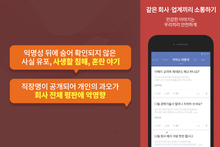 뿐만 아니라 주변에 물어보기 어려운 연봉, 이직 등의 회사 생활에 관한 정보는 물론 결혼, 육아, 재테크, 취미 생활 등 직장인의 관심사를 게시판 별로 나누어 소통할 수 있어 편리해요. 하지만 익명성 뒤에 숨어 확인되지 않은 사실을 유포해 개인의 사생활이 침해되거나 회사 내 혼란을 야기하는 경우도 종종 발생하죠. 또한 작성자의 회사명이 공개되다 보니 개인의 과오가 회사 전체 평판에 악영향을 줄 수도 있답니다.