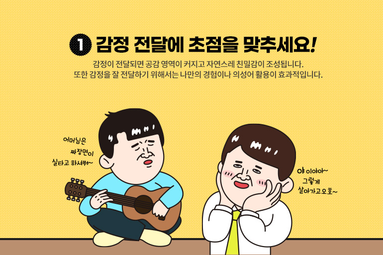 감정이 전달되면 공감 영역이 커지고 자연스레 친밀감이 조성됩니다. 또한 감정을 잘 전달하기 위해서는 나만의 경험이나 의성어 활용이 효과적입니다. “예전에 우리가 대학 다닐 때는 다들 돈이 없어서 어려웠지...”라고 말하는 것보다는 내 경험이 녹아들어야 합니다. 가령, 대학시절 돈이 없어 친구 셋이 자장면 곱빼기 하나 시켜 나눠먹은 얘기, 막걸리 안주는 오로지 새우깡이었다는 일화가 감정전달에 효과적이라는 겁니다.