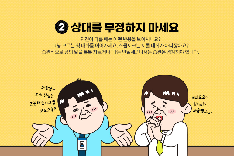 의견이 다를 때는 어떤 반응을 보이시나요? 그냥 모르는 척 대화를 이어가세요. 스몰토크는 토론 대회가 아니잖아요? 습관적으로 남의 말을 톡톡 자르거나 ‘나는 반댈세..’ 나서는 습관은 경계해야 합니다. 예를 들어, 동료가 새로 생긴 베트남식당 쌀국수가 정말 맛있다고 말했습니다. 그걸 듣고 있던 김 대리가 거기는 인스턴트 국물인데 뭐가 맛있냐는 둥, 쌀국수 맛을 모른다는 둥 타박할 필요가 없다는 거죠. 개인의 취향을 존중해주세요.