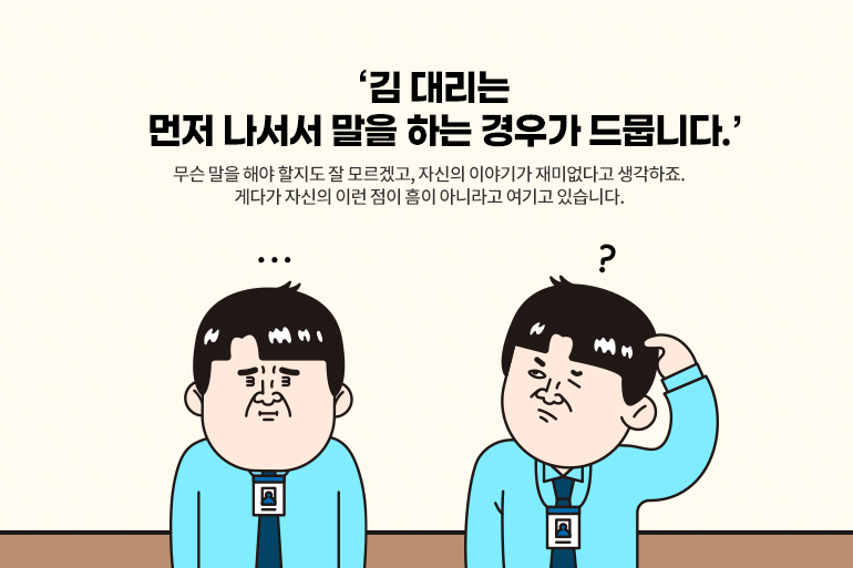 김 대리는 스스로 말주변이 없다고 생각해 먼저 나서서 말을 하는 경우가 드뭅니다. 무슨 말을 해야 할지도 잘 모르겠고, 자신의 이야기가 재미없다고 생각하죠. 게다가 자신의 이런 점이 흠이 아니라고 여기고 있습니다. 말수가 적다는 것은 단지 사람의 캐릭터라고 생각하기 때문이죠. 하지만 이런 점이 '비즈니스'로 엮이면 문제는 달라집니다.