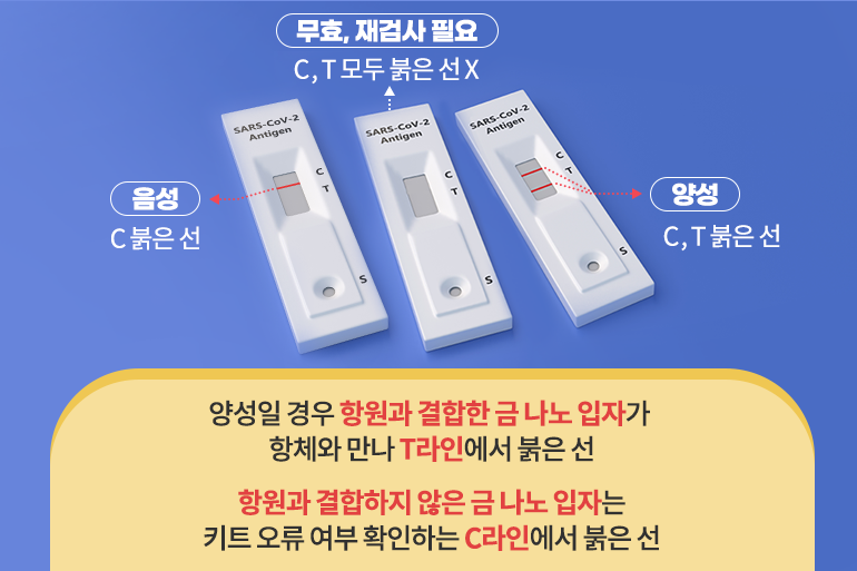 만약 바이러스에 감염된 상태라면 항원과 결합된 금 나노 입자가 T라인에서 항체와 결합해 붉은 선이 나타나게 되는 거예요. 옆에 있는 C라인(Control line, 대조군)은 키트의 오류 여부를 확인하는 기준으로 항원과 결합하지 않은 금 나노 입자가 결합해 역시나 붉은색을 띠게 되죠. 따라서 C와 T 모두 붉은 선이 나타나면 양성, C만 붉은 선을 띠면 음성, C에도 붉은 선이 없다면 무효이므로 새로운 키트로 검사를 진행해야 한답니다.