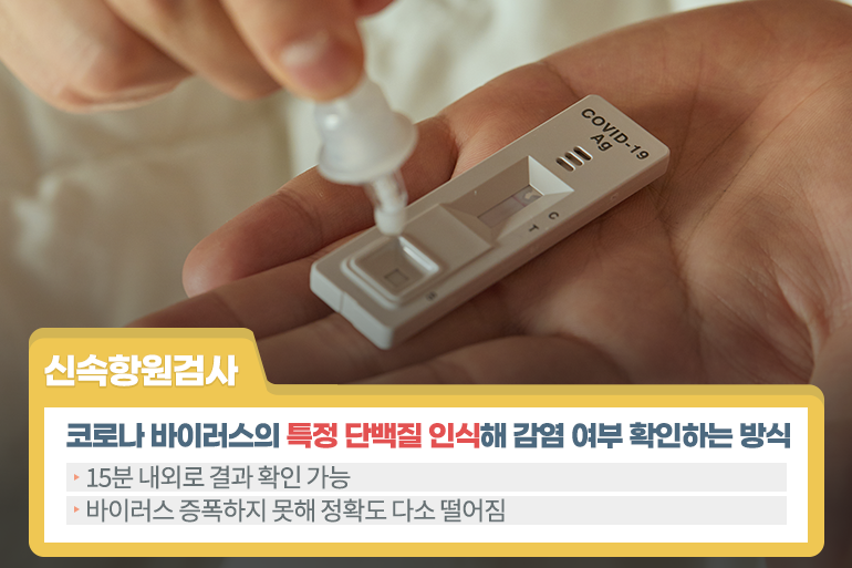 자가진단키트로 하는 검사는 신속항원검사로 코나 목의 점액을 채취한 후, 항원 진단시약을 이용하면 코로나 바이러스의 특정 단백질을 인식해 감염 여부를 확인할 수 있죠. 바이러스를 증폭하지 못하기 때문에 바이러스 양이 적으면 정확도가 다소 떨어지는데요. 대신 15분 내외로 결과를 확인할 수 있어 편리하죠. 이외에도 소량의 혈액을 추출해 항체 생성 여부를 파악하는 항체 검사 방식이 있어요. 항체가 생성되기 전인 감염 초기에는 감염 여부를 알기 어렵지만 과거 감염 이력까지 확인이 가능하며, 검사 시간이 짧다는 장점이 있답니다.