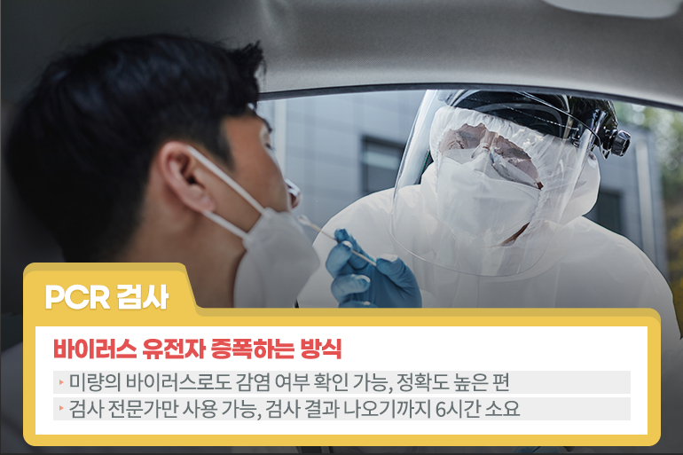 PCR 검사와 신속항원검사 모두 코를 찔러 감염 여부를 확인하는데 결과가 나오는 시간이나 정확도가 다른 이유는 뭘까요? PCR(중합효소 연쇄반응) 검사는 코 또는 목의 점액을 채취한 후 바이러스 유전자를 증폭해 감염 여부를 확인하는 방식이에요. 덕분에 미량의 바이러스로도 감염 여부를 알 수 있고, 정확도 역시 매우 높은 편이죠. 하지만 의료인 또는 검사 전문가만 사용이 가능하며, 검사 결과가 나오기까지 6시간 이상이 소요된다는 단점이 있어요.