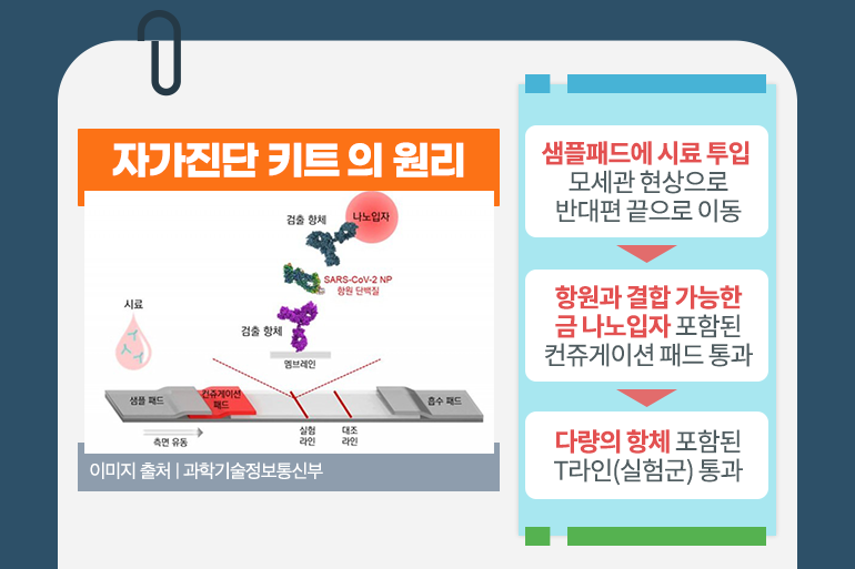 자가진단키트 대부분은 검체 시료를 묻히는 샘플 패드 부분과 결과가 나오는 부분으로 나누어져 있어요. 샘플패드 부분에 바이러스가 포함된 검체 시료를 얹으면 모세관 현상에 의해 키트의 반대편 끝으로 이동하는데요. 이때 샘플패드와 결과가 나오는 부분 사이에 위치한 컨쥬게이션 패드 안에 항원과 결합할 수 있는 금 나노 입자가 다량으로 포함되어 있어요. 그리고 금 나노 입자와 결합한 항원이 패드를 지나 도달하게 되는 T라인(Test line, 실험군)에는 다량의 항체가 존재하죠.