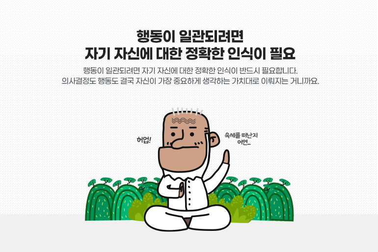 행동이 일관되려면 자기 자신에 대한 정확한 인식이 반드시 필요합니다. 의사결정도 행동도 결국 자신이 가장 중요하게 생각하는 가치대로 이뤄지는 거니까요. 가령, ‘나는 실패하더라도 도전을 한다는 것 자체가 더 중요한가, 아니면 실패를 하지 않는 것이 더 중요한가’와 같이 자신의 ‘업무 가치’에 대해 명확해져야 스스로도 일관된 결정을 내릴 수가 있습니다.