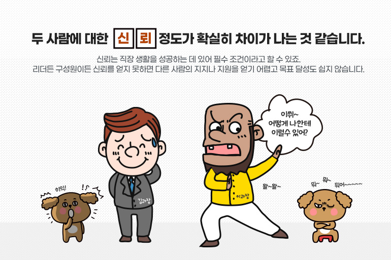 “김과장이 프로젝트를 진행한다고 하면 상사도 동료들도 환영하며 기꺼이 협조를 합니다. 그런데 이과장은 그렇지가 않죠. 두 사람에 대한 OO 정도가 확실히 차이가 나는 것 같습니다.”