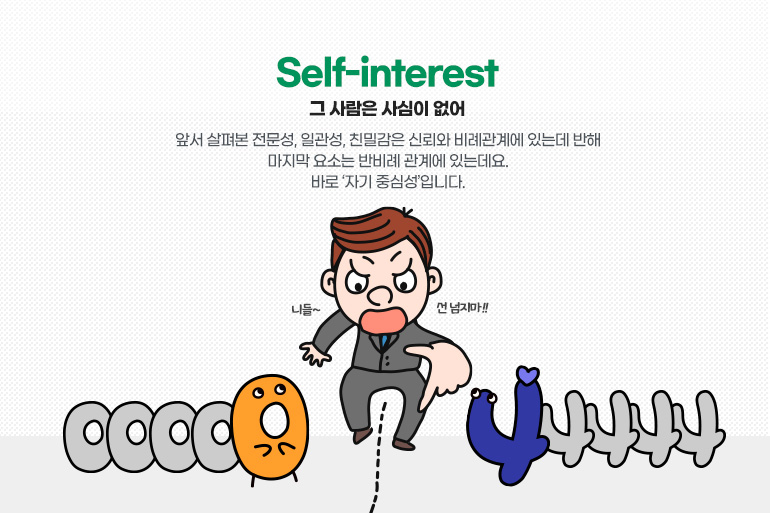 앞서 살펴본 전문성, 일관성, 친밀감은 신뢰와 비례관계에 있는데 반해 마지막 요소는 반비례 관계에 있는데요. 바로 ‘자기 중심성’입니다. 조직의 구성원으로서 내리는 의사결정이 자기 자신의 이익을 위한 것, 흔히 말해 사심(私心)에 의한 것이라면 신뢰를 얻기가 매우 어렵죠.