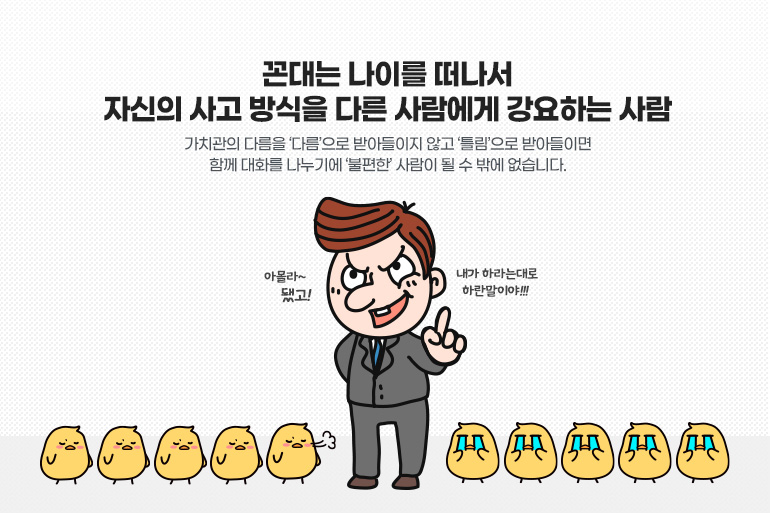 꼰대는 나이를 떠나서 자신의 사고 방식을 다른 사람에게 강요하는 사람이죠. 돈이나 성공, 또는 성실함을 최고의 가치로 여기는 사람이 있는가 하면 돈, 성공보다 인생을 즐기는 게 더 중요한 가치인 사람도 있습니다. 이런 가치관의 다름을 ‘다름’으로 받아들이지 않고 ‘틀림’으로 받아들이면 함께 대화를 나누기에 ‘불편한’ 사람이 될 수 밖에 없습니다. 그러니 업무적으로 반드시 필요한 ‘일치’가 아니라면 서로의 다름을 있는 그대로 받아들일 수 있는 지혜가 필요합니다.