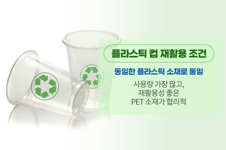 플라스틱이 재활용 되기 위해선 크기가 크거나 재질이 명확해야 하는데 우리가 사용하는 일회용 컵의 경우 크기가 작고, 재질도 제각각이다 보니 재활용이 더욱 어려워요. 재활용률을 높이기 위해서는 일회용 컵의 재질을 PET(페트)로 통일시키면 되는데요. 재질이 통일되면 크기가 작아도 재활용이 용이한 데다가 PET 소재는 재활용성이 뛰어나요. 또한 이미 많은 카페에서 PET 재질의 일회용컵을 사용하고 있으니 PET 소재로 통일하는 것이 가장 합리적이죠. 비닐 소재로 만든 뚜껑은 깔끔하게 뜯기가 어렵다 보니 뚜껑까지 PET 소재로 통일하는 것이 재활용률 높이는 방법이랍니다.
