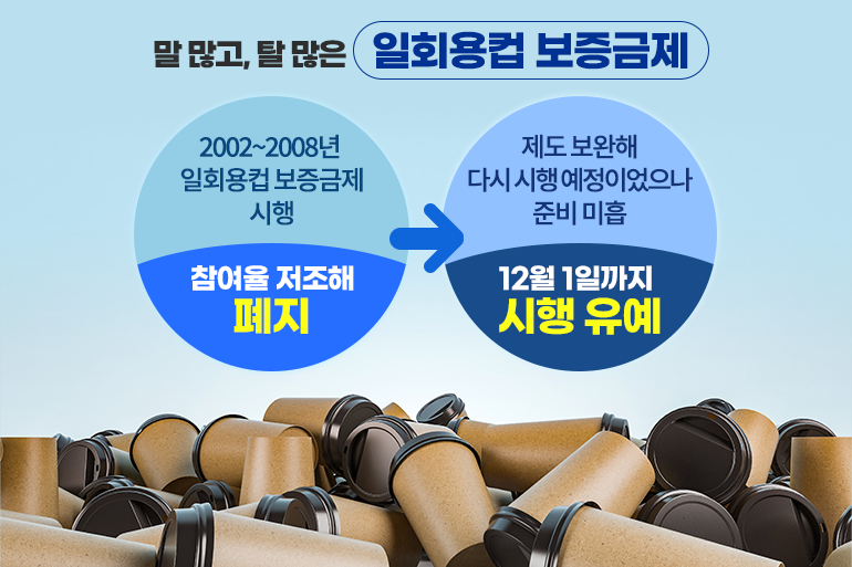 사실 2002년부터 일회용컵 보증금제가 시행되었으나 교차 회수가 불가능했고, 보증금 금액도 50~100원 수준으로 낮아 참여율이 저조해 2008년 폐지되었는데요. 일회용컵으로 인한 환경오염 문제가 커지면서 제도를 보완해 올 6월부터 재시행을 결정했죠. 하지만 프랜차이즈에서 일회용컵 보증금제에 대한 준비가 미흡해 가맹점주들이 부담을 떠안아야 했고, 가맹점주의 부담을 줄여줄 무인회수기 설치 역시 미비해 제도 시행에 차질이 생기게 되었어요. 이로 인해 정부에서는 올해 12월 1일까지 일회용컵 보증금제 시행을 유예한 상태랍니다.