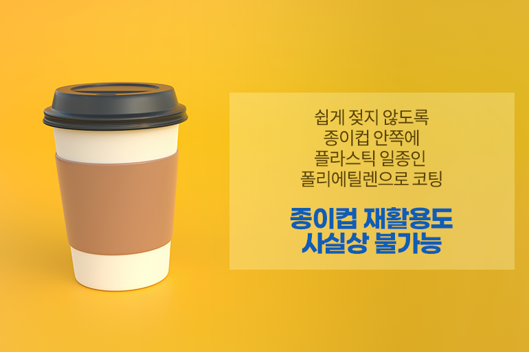 그렇다면 플라스틱 보다 훨씬 친환경적인 종이컵을 사용하면 자원 재활용에 도움이 되지 않을까요? 안타깝게도 우리가 주로 사용하는 종이컵 역시 100개 중 1개 정도만 재활용이 가능한 실정이에요. 카페에서 사용하는 종이컵은 액체류를 담아도 쉽게 젖지 않는데요. 이는 종이컵 안쪽에 플라스틱의 일종인 ‘폴리에틸렌’으로 코팅이 되어있기 때문이에요.