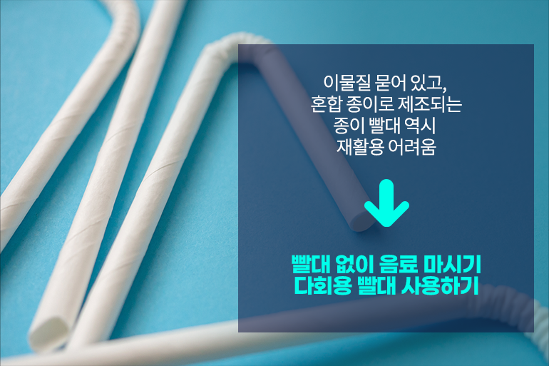최근 플라스틱 빨대를 대신해 사용하는 종이 빨대 역시 종이 소재지만 재활용은 어려운 상황이에요. 음료로 인해 이물질이 묻었거나 젖어 있는 상태이고, 혼합 종이로 제조되는 경우가 많기 때문에 종이류가 아닌 일반쓰레기로 처리해야 하죠. 환경을 생각한다면 빨대 없이 음료를 마시거나 다회용 빨대를 챙겨 다니는 것이 바람직한 방법이에요.