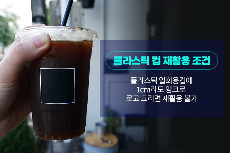 많은 분들이 플라스틱 컵은 깨끗하게 씻어서 버리면 충분히 재활용이 가능하다고 생각하실 텐데요. 플라스틱 컵 재활용의 조건은 생각보다 매우 까다로워요. 우선 일회용 컵에 단 1cm라도 잉크로 로고를 그리게 되면 재활용은 불가능해요. 플라스틱 제품을 재활용하기 위해서는 다른 화학물질이 섞이지 않은 투명 상태여야 하는데 로고 잉크가 들어가는 순간 재활용은 어려워지죠. 물론 로고를 지우거나 잘라내는 방법도 있지만 비용 문제로 처리가 곤란한 것이 현실이에요.