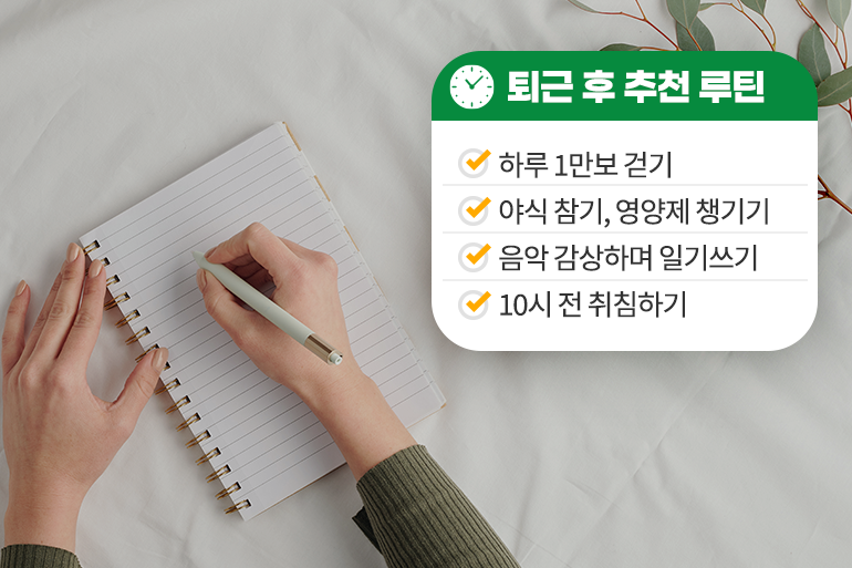 퇴근 후에는 하루 1만보 이상 걷기, 야식 참기, 영양제 챙겨 먹기, 좋아하는 음악 들으며 일기 쓰기, 10시 전에 취침하기 등 나를 행복하고, 건강하게 만들 수 있는 것이라면 무엇이든 ‘갓생’살기 루틴에 넣어도 괜찮아요 😊