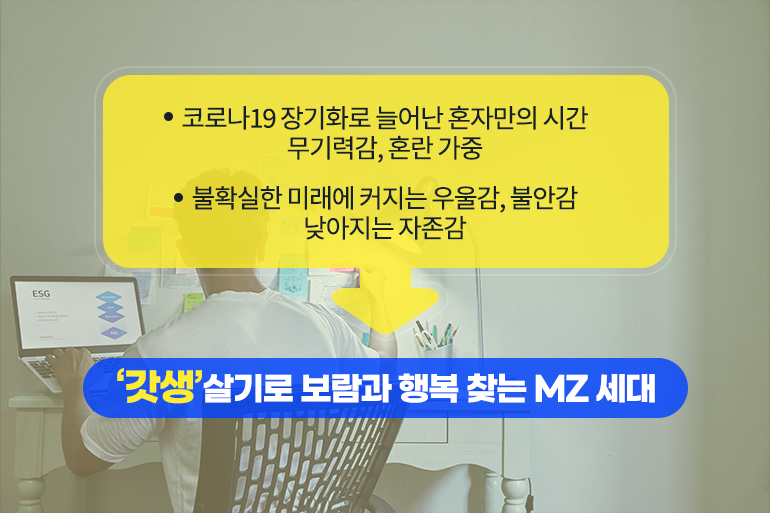 MZ세대에게 ‘갓생’이 유행하기 시작한 것은 코로나19 확산 이후인데요. 코로나19의 장기화로 혼자 보내는 시간이 많아지면서 무기력감을 느끼는 것은 물론, 늘어난 시간을 어떻게 사용해야 할지 몰라 혼란스러워졌죠. 게다가 불확실한 미래에 대한 불안감과 우울감이 커지고, 자존감이 낮아져 고민하는 이들이 점차 많아졌어요. 하지만 이러한 현실에 안주하거나 낙담하지 않고 삶을 조금 더 의미있게 살아보려는 노력으로 탄생한 것이 바로 ‘갓생’이에요.