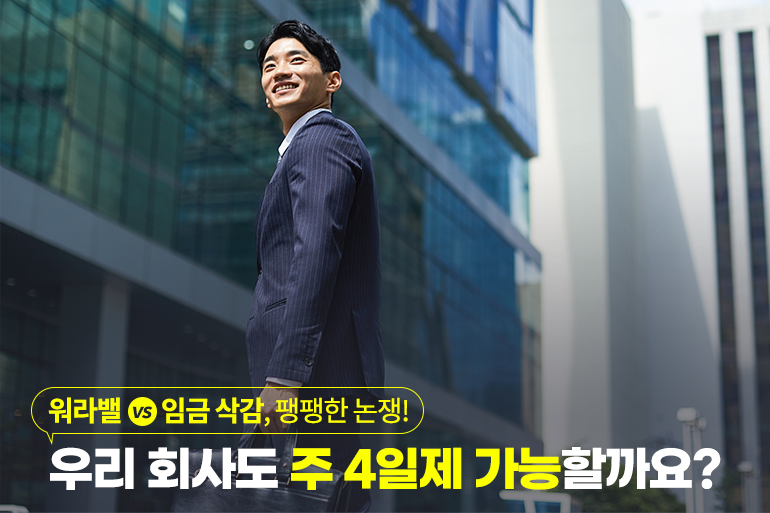 대부분의 직장인들은 주중에 하루라도 휴일이 생기면 더 즐겁고, 힘이 나기 마련이죠! 그렇다면 일주일에 네 번만 출근을 하는 ‘주 4일제’가 시행된다면 어떨까요? 멀게만 느껴졌던 주 4일제가 일부 기업에서 도입되면서 이제 우리 회사도 주 4일제가 시행될지 모른다는 기대감을 품게 되는데요. 하지만 주 4일제 시행과 관련된 우려의 목소리도 커지면서 찬반 입장이 팽팽하게 맞서고 있는 상황이에요. 그래서 오늘은 주 4일제 시행의 장단점을 자세히 살펴보도록 할게요!