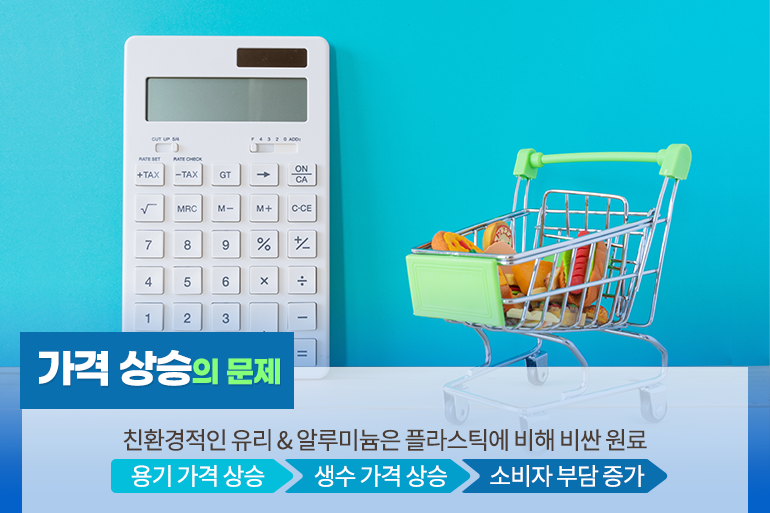 생수를 담는 용기로 페트병을 고집하는 첫 번째 이유는 가격 때문인데요. 알루미늄이나 유리 소재는 플라스틱에 비해 원료 가격이 훨씬 비싸기 때문에 생수 가격 자체가 상승하게 돼요. 따라서 소비자들의 부담을 늘리지 않기 위해 페트병을 고집하는 거죠.