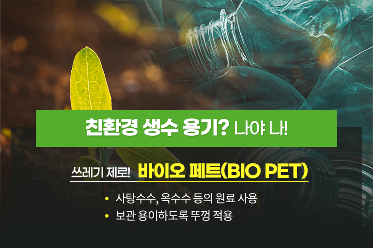최근에는 용기와 뚜껑까지 100% 생분해되는 ‘바이오 페트’ 소재가 개발되었는데요. 사탕수수와 옥수수에서 추출한 원료를 소재로 완전히 분해가 가능하다고 해요. 이러한 친환경 소재가 상용화된다면 생수 페트 용기로 인한 플라스틱 배출 문제도 말끔하게 해결이 가능하겠네요.