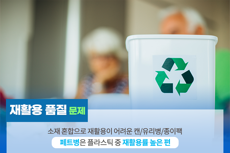 네 번째 이유는 재활용 품질의 문제인데요. 캔이나 유리병, 종이팩 등을 생수 용기로 만들기 위해서는 여러 소재가 혼합되기 때문에 재활용이 쉽지 않아요. 오히려 페트병이 플라스틱 중에서도 재활용률이 좋은 편에 속하기 때문에 생수 용기로 적합하다고 판단한 것이죠.