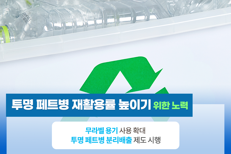 투명 페트병 분리배출 의무화 제도가 시행되면서 페트병 재활용은 더욱 활발해지고 있는 추세예요. 페트 용기는 플라스틱 중에서도 고품질 재활용이 가능한 재질인데요. 식품 용기로 반복 재활용하거나 옷, 신발 등의 섬유 소재로도 활용이 가능하죠. 참고로 모든 페트 소재는 재활용이 가능하지만, 서로 다른 페트 소재가 섞이면 재활용이 어려워질 수 있어요. 따라서 물이나 음료 등이 담겼던 투명 페트병을 분리해 배출해야 한다는 것을 꼭 기억해 주세요!
