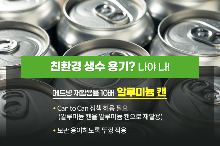 궁극적으로 플라스틱 배출량을 줄이기 위해서는 친환경적인 생수 용기를 찾기 위한 노력을 멈추지 않아야 겠죠. 우선 페트병보다 재활용률이 10배 높은 알루미늄 캔을 생수 용기로 대체할 수 있다면 좋을 텐데요. 몇 가지만 보완하면 충분히 사용이 가능해요. 알루미늄 캔을 다시 알루미늄 캔으로 재활용할 수 있는 ‘캔 투 캔(Can to Can)’이 정책적으로 허용되고, 보관이 용이하도록 뚜껑을 여닫는 방식이 적용된다면 캔에 담긴 생수도 충분히 상용화될 수 있을 거예요.