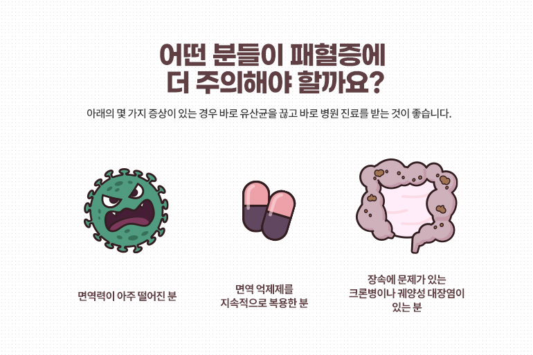 그렇다면 어떤 분들이 패혈증에 더 주의해야 할까요? 첫 번째, 면역력이 아주 떨어진 분들입니다. 예를 들면 암환자가 항암치료를 받는 도중에 고용양의 유산균을 복용하는 것에 주의해야 합니다. 두 번째, 면역 억제제를 지속적으로 복용한 경우입니다. 다른 질병 치료를 위해 면역 억제제를 복용한 경우 면역력이 떨어진 상태에서 과도한 유산균이 들어왔을 때 패혈증의 위험성이 있어 조심해야 합니다. 이런 경우 반드시 담당 주치의와 상담 후 복용해야 합니다. 세 번째, 장속에 문제가 있는 크론병이나 궤양성 대장염이 있는 분은 담당 주치의와 꼭 상의하면서 복용하는 것이 좋습니다. 위의 몇 가지 증상이 있는 경우 바로 유산균을 끊고 바로 병원 진료를 받는 것이 좋습니다.