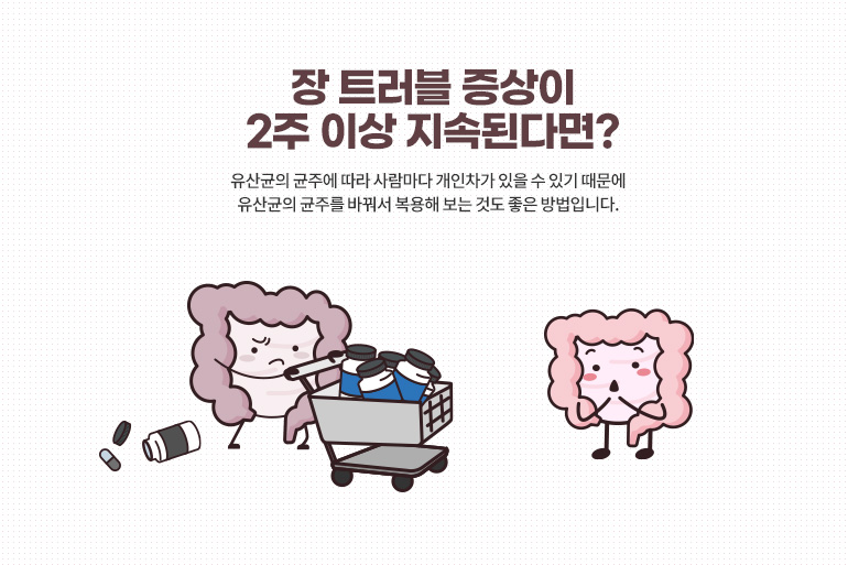 그런데 이런 증상이 호전되지 않고 2주 이상 지속된다면 본인과 맞지 않는다고 생각해 보아야 합니다. 실제로 임상에서도 똑같은 유산균을 썼을 때 어떤 분들은 너무 효과적이어서 좋다고 하는 분들도 있지만 어떤 분들은 변비가 더 심해졌다고 하는 분들도 있습니다. 유산균의 균주에 따라 사람마다 개인차가 있을 수 있기 때문에 유산균의 균주를 바꿔서 복용해 보는 것도 좋은 방법입니다.