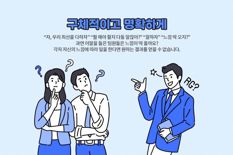 과연 이말을 들은 팀원들은 느낌이 딱 올까요? 각자 자신의 느낌에 따라 일을 한다면 원하는 결과를 얻을 수 없습니다. 특히 리더들은 작은 지시사항이라도 혹시 팀원이 오해할 수 있지 않을까를 면밀히 따져보는 것이 중요합니다. 팀원과 리더가 ‘same page’에 있는지를 서로 확인하는 거죠. 가장 좋은 방법은 리더가 어떤 사안에 대해 지시한 후 팀원에게 “자, 김대리 이 사안을 어떻게 진행할지 들어볼까요? 라고 요청해서 확인하는 것입니다.