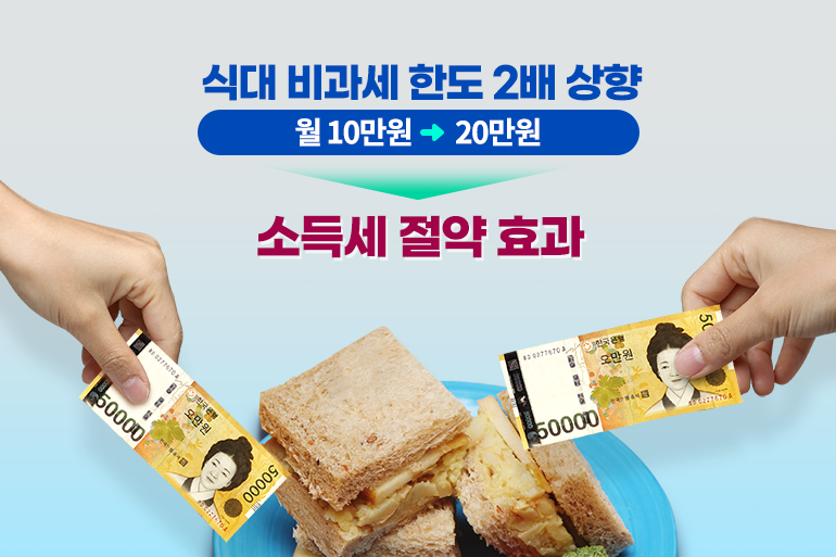 내년부터는 직장인들의 점심값 부담을 조금이나마 줄이기 위해 급여에 포함된 식대에 대한 비과세 한도가 월 10만원에서 20만 원으로 늘어날 예정이에요. 이번 개정으로 총급여가 2천7백만 원 이하인 근로자는 약 7만 2천 원, 6천만 원이면 약 18만 원, 8천만 원이면 약 29만 원의 세금을 줄일 수 있게 될 거예요.