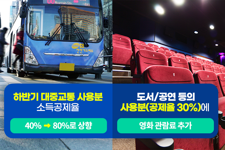 추가공제 한도 역시 전통시장, 대중교통, 도서/공연 등 항목이 각 100만원이었던 것을 통합 300만 원으로 변경했는데요. 이러한 단순화, 통합화 정책으로 지금보다 공제 금액이 늘어날 전망이에요. 이외에도 하반기 대중교통 사용분 소득공제율은 40%에서 80%로 상향되며, 도서/공연 등의 사용분(공제율 30%)에 영화 관람료도 추가된답니다.