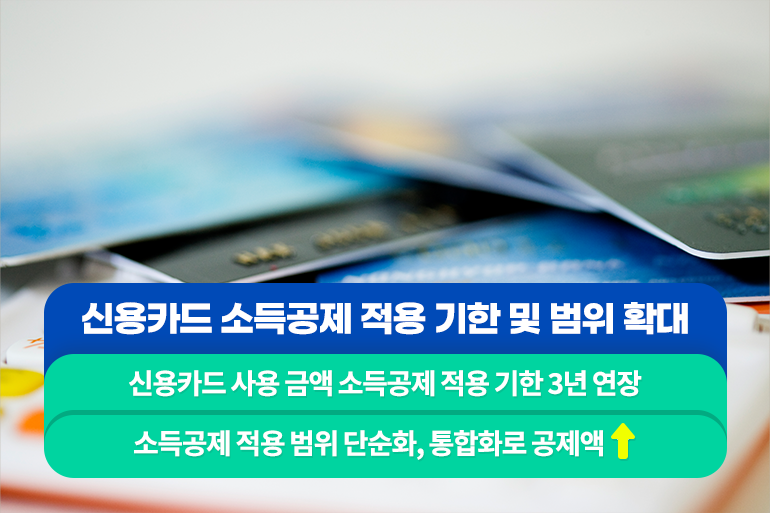 대부분의 직장인들이 신용카드를 사용하다 보니 연말정산에서 신용카드 사용금액에 대한 공제 혜택을 많이 받았죠. 그런데 신용카드 소득공제가 올해가 마지막이었다는 사실! 다행히도 신용카드 사용금액에 대한 소득공제 적용기한을 3년 연장해 직장인의 세금 부담을 덜어주는 것으로 변경되었다고 해요. 또한 급여 수준에 따른 추가 공제 한도도 3단계로 나누어진 기존과 달리 7천만 원 이하, 7천만 원 초과 2단계로 단순화시켰어요.
