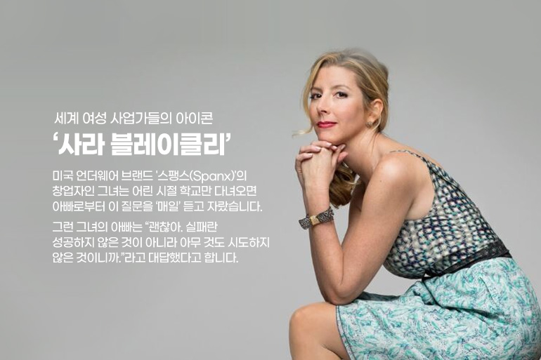 그런데 이 질문을 ‘매일’ 듣고 자란 사람이 있습니다. 바로 세계 여성 사업가들의 아이콘이라고 할 수 있는 '사라 블레이클리'입니다. 미국 언더웨어 브랜드 '스팽스(Spanx)'의 창업자인 그녀는 어린 시절 학교만 다녀오면 아빠로부터 이 질문을 들었는데요. 속상하긴 하지만 뭔가 망친 일, 실수한 일을 털어놓았다고 하죠. 그런 그녀의 아빠는 “괜찮아. 실패란 성공하지 않은 것이 아니라 아무 것도 시도하지 않은 것이니까.”라고 대답했다고 합니다.