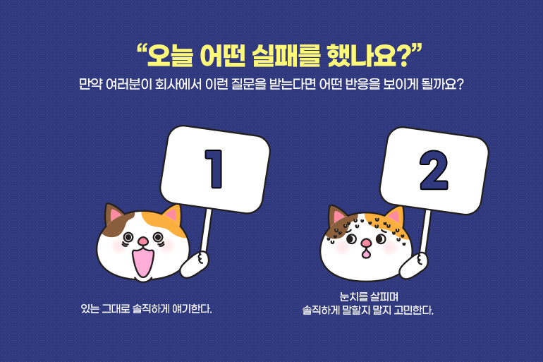 만약 여러분이 회사에서 이런 질문을 받는다면 어떤 반응을 보이게 될까요? 1번: 있는 그대로 솔직하게 얘기한다. 2번: 눈치를 살피며 솔직하게 말할지 말지 고민한다. 아마 대부분의 경우 2번을 답할 것 같은데요. 어찌 됐건 ‘실패’라고 하면 부정적 감정을 불러일으키니까요.