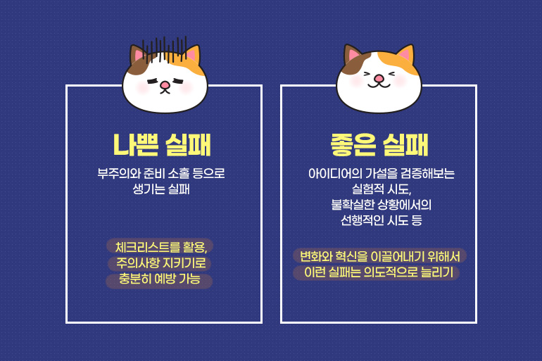 그런데 이런 의문이 들 수도 있습니다. ‘실패는 어떤 거든 다 괜찮다고 해줘야 하는 건가? 그게 조직에서 가능한 일인가?’ 답은 물론 아닙니다. 실패는 반드시 2가지로 구분돼야 합니다. 먼저 ‘나쁜 실패’는 부주의와 준비 소홀 등으로 생기는 실패인데요. 체크리스트를 활용하거나 주의사항을 지키는 것만으로도 충분히 예방할 수 있기 때문에 이런 실패는 확실하게 ‘관리’를 해야 합니다. 반면, ‘좋은 실패’는 아이디어의 가설을 검증해보는 실험적 시도, 불확실한 상황에서의 선행적인 시도 등입니다. 변화와 혁신을 이끌어 내려면 조직은 이런 실패를 ‘의도적으로’ 늘려야 하겠죠.