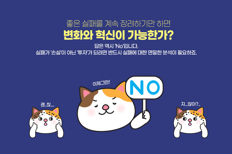 또한 ‘좋은 실패를 계속 장려하기만 하면 변화와 혁신이 가능한가?’하는 거죠. 답은 역시 ‘No’입니다. 실패가 ‘손실’이 아닌 ‘투자’가 되려면 반드시 실패에 대한 면밀한 분석이 필요하죠.