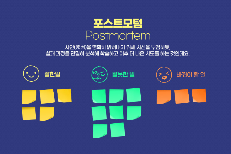 이를 실리콘밸리에서는 포스트모텀(Postmortem), 즉 사후 부검이라고 부릅니다. 사인(死因)을 명확히 밝혀내기 위해 시신을 부검하듯, 실패 과정을 면밀히 분석해 학습하고 이후 더 나은 시도를 하는 것인데요. 관련된 사람들을 모두 참여시켜서 솔직하게 공유하되 사람 탓으로 질책하는 대신 What, Why 중심으로 피드백하는 과정을 통해 앞으로의 개선할 부분을 찾는 거죠.