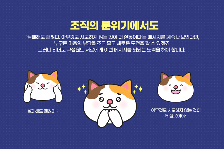조직에서도 마찬가지일 겁니다. 조직의 분위기가 ‘실패해도 괜찮다. 아무것도 시도하지 않는 것이 더 잘못이다.’는 메시지를 계속 내보인다면, 누구든 마음의 부담을 조금 덜고 새로운 도전을 할 수 있겠죠. 그러니 리더도 구성원도 서로에게 이런 메시지를 되뇌는 노력을 해야 합니다.
