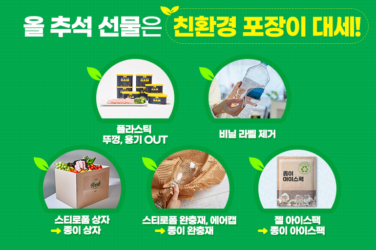 매년 명절이면 ‘선물 과대 포장’ 이슈가 화두에 오르죠. 하지만 최근에는 환경을 위해 가치소비를 하는 분들이 많아지면서 친환경 포장이 대중화되었어요. 불필요한 플라스틱 뚜껑이나 용기를 없애고, 비닐로 된 라벨지도 사라지는 추세죠. 스티로폼 상자 대신 종이상자, 스티로폼 완충재나 에어캡 대신 종이 완충재, 젤 아이스팩 대신 물을 얼린 종이 아이스팩을 사용한 제품도 많아졌어요.