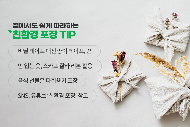 접착이 필요할 땐 비닐 테이프 대신 종이테이프나 재활용이 가능한 끈을 사용하면 더욱 좋아요. 불필요한 포장은 모두 없애고 입지 않는 옷이나 스카프 등을 잘라 리본으로 묶어 주면 감각적인 선물 포장이 될 수 있죠. 음식 선물의 경우 재사용 가능한 밀폐용기에 담아서 전달하면 더 깔끔하고, 실용적이에요. 참고로 SNS나 유튜브에 ‘친환경 포장’을 검색해서 따라 하면 친환경 포장재로도 누구나 쉽게 예쁜 포장이 가능하답니다.