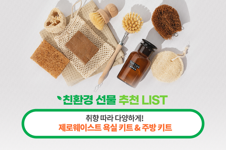 비누 형태로 된 샴푸바와 설거지바, 고체 치약, 천연 소재 수세미, 대나무 칫솔 등은 제로 웨이스트를 실현할 수 친환경 선물로 인기가 높아요. 최근에는 제로 웨이스트 욕실 키트, 주방 키트 형태로 판매되어 선물하기가 더욱 편해졌어요. 이외에도 폐기물에 새로운 가치를 더한 업사이클링 제품(가방, 지갑, 의류 등)을 추석 선물로 선택하는 것도 친환경에 동참하는 좋은 방법이랍니다.