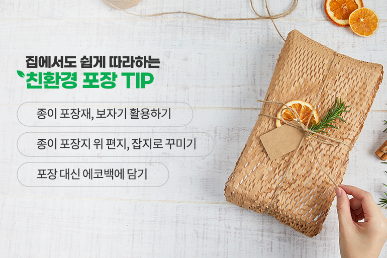 매년 명절이면 ‘선물 과대 포장’ 이슈가 화두에 오르죠. 하지만 최근에는 환경을 위해 가치소비를 하는 분들이 많아지면서 친환경 포장이 대중화되었어요. 불필요한 플라스틱 뚜껑이나 용기를 없애고, 비닐로 된 라벨지도 사라지는 추세죠. 스티로폼 상자 대신 종이상자, 스티로폼 완충재나 에어캡 대신 종이 완충재, 젤 아이스팩 대신 물을 얼린 종이 아이스팩을 사용한 제품도 많아졌어요.