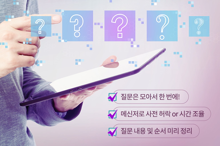 그리고 시도때도 없이 상사를 찾아가 질문을 하는 것은 절대 금물! 궁금한 점을 한 번에 모아 상사가 여유 있는 타이밍에 질문을 하는 것이 중요한데요. 미리 메신저로 허락을 구하거나 괜찮은 시간대를 확인하면 불편한 상황을 차단할 수 있겠죠. 여러 번 질문하지 않도록 질문할 내용과 질문 순서를 미리 메모해두면 실수를 줄일 수 있어요.