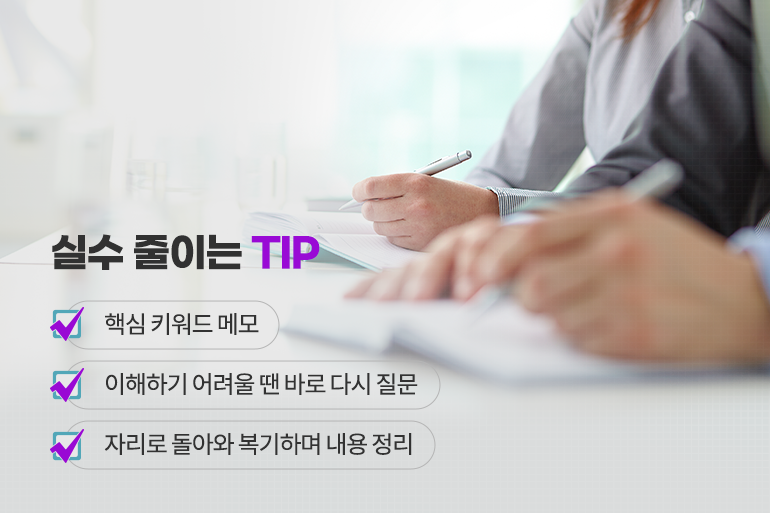 여러 번 같은 질문을 반복하거나 실수를 줄이기 위해서는 꼼꼼한 메모는 필수예요. 답변을 들을때는 핵심 키워드 위주로 메모하고 이해하기 어려운 부분은 바로 다시 질문해 확실하게 짚고 넘어가는 것이 좋아요. 자리로 돌아와 들은 내용을 한 번 더 복기하고, 업무노트에 정리해두어야 잊지 않고 확실하게 기억할 수 있답니다.
