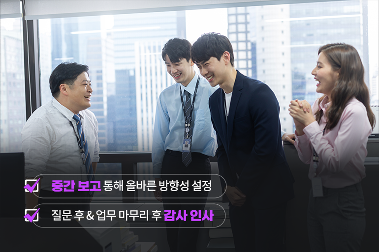마무리까지 실수없이 확실하게 해내고 싶다면 중간 점검을 받는 것도 좋은 방법인데요. 잘못된 방향으로 일을 했다가 시간을 낭비하는 일이 없도록 보고서나 기획안 등을 작성해 중간보고를 하면 더 나은 방향성을 사수가 제안해 줄 수 있죠. 질문 후에는 사수에게 충분한 감사의 뜻을 전하고, 일이 마무리된 후에도 “선배님 덕분에 일을 잘 마칠 수 있었다”는 인사를 건네면 앞으로 질문을 하기가 조금은 더 편해질 수 있겠죠? 😊