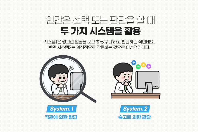 행동경제학에 따르면 인간은 선택 또는 판단을 할 때 두 가지 시스템을 활용한다고 합니다. 시스템1은 찡그린 얼굴을 보고 ‘화났구나’라고 판단하는 식인데요. 반면 시스템2는 의식적으로 작동하는 것으로 이성적입니다. 복잡한 수학 문제를 풀 때에 해당되겠죠. 시스템1은 '직관에 의한 판단', 시스템2는 '숙고에 의한 판단'이라고 보면 됩니다. 시스템2의 처리 속도는 시스템1에 비해 비교도 안되게 느리겠죠.